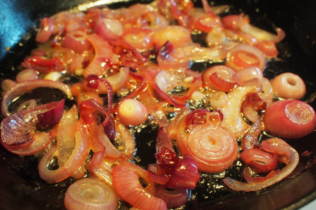 Karamellisoitu sipuli oli muuten aivan tajuttoman hyvää. Ohje löytyy netistä täältä. Sipulin juju on siinä, että kun sitä hauduttaa voissa miedolla lämmöllä pitkään, se karamellisoituu ja muuttuu lempeän makeaksi ja pehmeäksi.