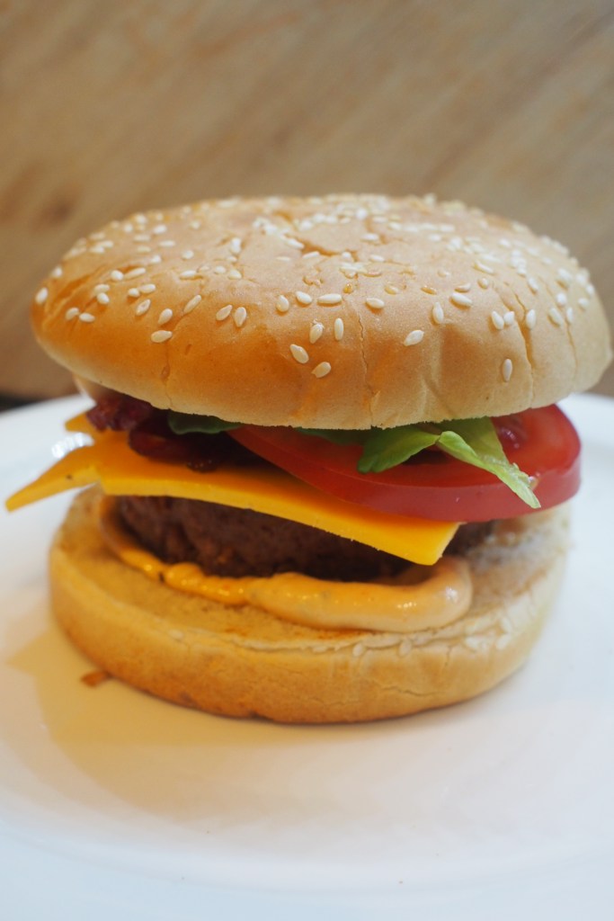 Täytteenä meillä oli pihvin lisäksi salaattia, tomaattia, suolakurkkua, pitkään kypsytettyä cheddarjuustoa, hampurilaiskastiketta ja karamellisoitua sipulia.