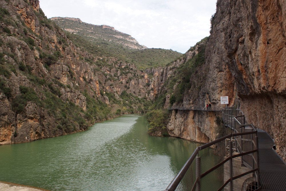 Siinä syödessämme ohitsemme kulki ihmisiä pikkutietä pitkin, ja ihmettelimme, mihin he olivat matkalla. Muutamat pysähtyivät kyselemään meiltäkin, mitä tien päässä on. Meillä ei tietystikään ollut mitään tietoa, mutta uteliaisuus heräsi ja lähdimme seuraamaan ihmisiä. Kyllä kannatti! Tien päässä oli upea turkoosinsininen vuoristojärvi jyrkkien vuorenseinämien välissä. Vuorenseinämille oli tehty metalliritilöistä kävelyreitti, jota pitkin olisi voinut kulkea pitemmänkin matkan. Reitti oli sen verran hurjan näköinen ja kaukana alhaalla kuohuva joki näytti aika pelottavalta, että käännyimme melko nopeasti takaisin ja tyydyimme ihailemaan henkeäsalpaavia maisemia tukevasti maanpinnalta.