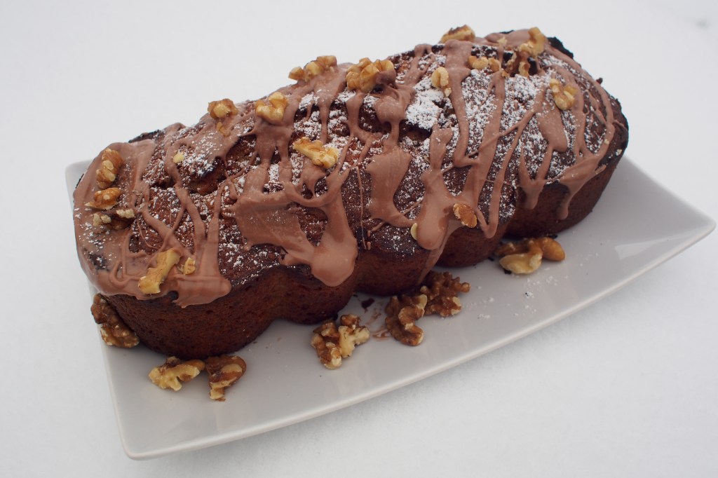- Notkista pieni nokare Nutellaa muutaman sekunnin ajan mikrossa ja valuta se raidoiksi kakun päälle. Koristele kakku pähkinöillä ja tomusokerilla.
