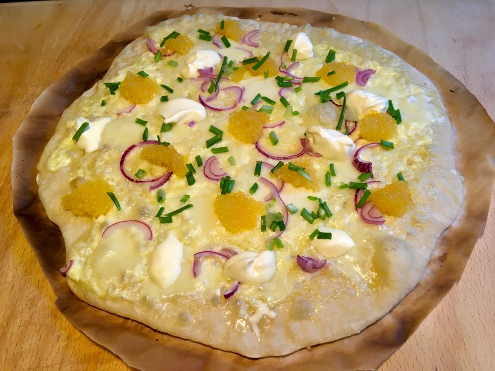 Mieheni kävi työmatkalla Tukholmassa ja hän kertoi syöneensä siellä uskomattoman hyvää (ja uskomattoman kallista) pizzaa. Pizzan pohja oli ohuen ohut ja täytteinä oli pelkästään juustoa, mätiä, smetanaa ja sipulia. Hintaa tukholmalaisella gourmet-pizzalla oli kolmisenkymmentä euroa, joten ihan perusroiskeläppä se ei ollut.