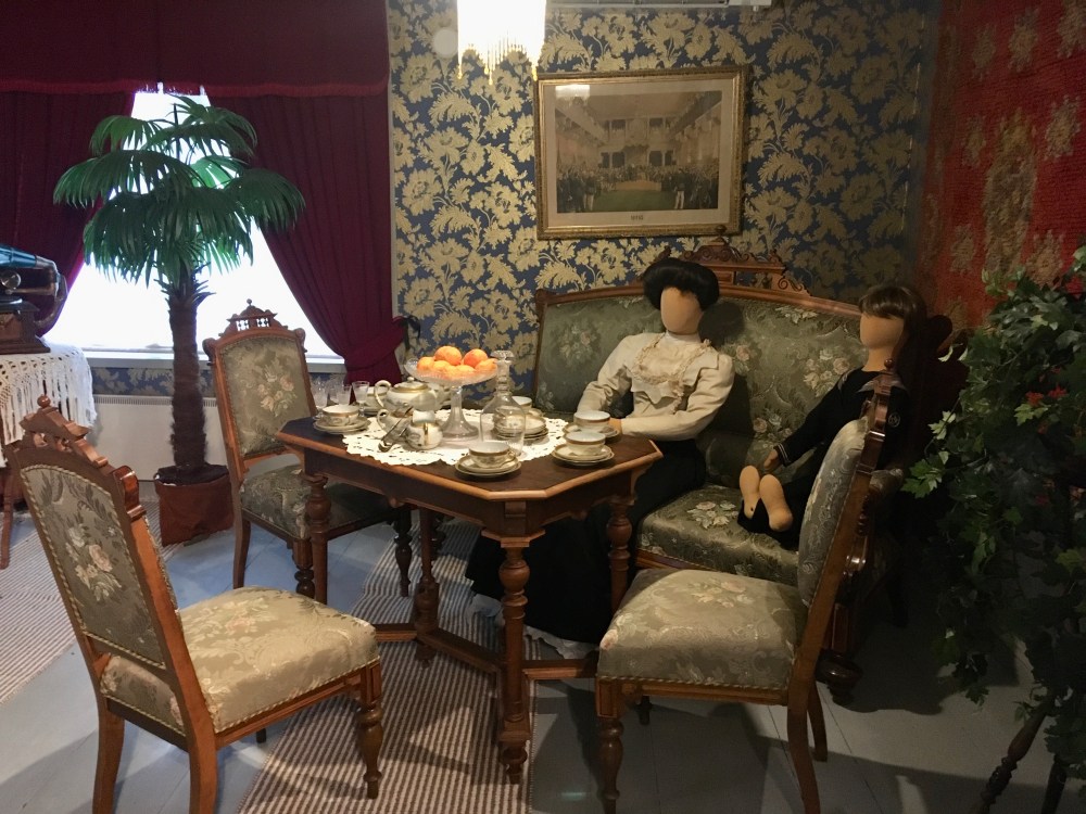 Yläkerta on sisustettu tunnelmallisesti 1800-luvun tyyliin. Kauppiasperhe lapsineen viettää siellä juhlia, pöytä on katettu upeilla astioilla ja vieraat istuvat sohvalla tyylikkäissä juhlapuvuissaan.