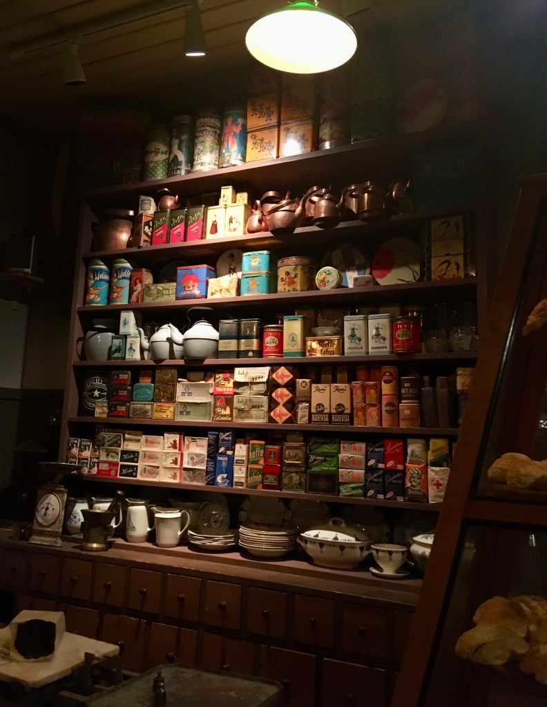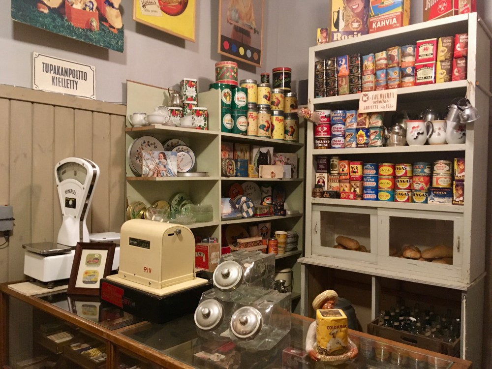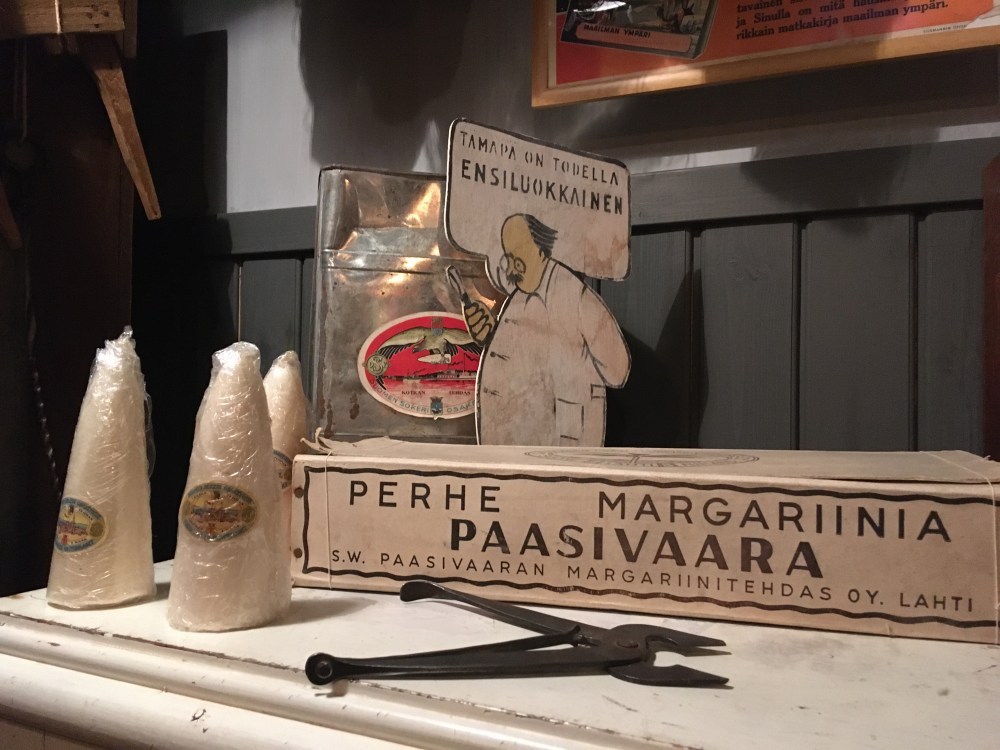 Itse Puotimuseo on hieno aikamatka menneisyyteen. Sinne on rakennettu kaksi täydellistä vanhanajan puotia tavaroineen, toinen 50-luvulta ja toinen vuosisadan vaihteesta. Hyllyt ovat täynnä alkuperäistä tavaraa, osa vielä avaamattomissa pakkauksissa. Vaikka en itse olekaan elänyt 50-luvulla, niin tunnistin silti monia tavaroita, joita olen lapsena nähnyt mökillä tai mummulassa. Porukan pienin kyllä sanoi, ettei oikein arvosta vanhoja tavaroita (sota-ajan juttuja lukuunottamatta!), mutta historiasta kiinnostuneille museossa on paljon mielenkiintoisia juttuja ja menneen ajan tunnelmaa.