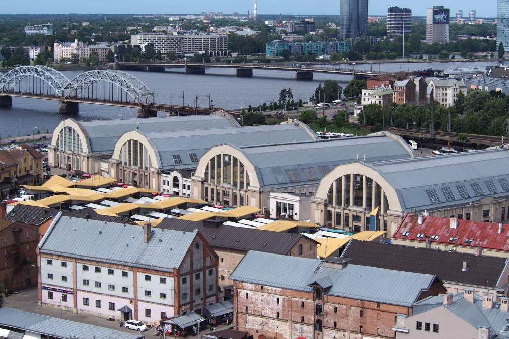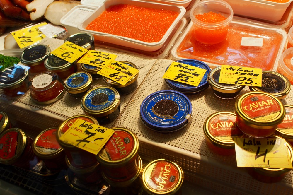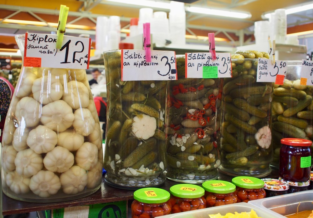 Riian keskustorin valtavat hallit on rakennettu aikanaan ilmalaivoja varten. Vuonna 1930 ne muutettiin kauppahalliksi, jossa riittää vilinää joka päivä. Kauppahallin ja sitä ympäröivän torin alueella on yli 3000 myyntikojua, ja keskustorin nettisivujen mukaan alueella vierailee päivittäin jopa 100 000 ihmistä. Arvio ei varmasti jää kovin kauas totuudesta, niin paljon ihmisiä siellä oli tälläkin kertaa. Valikoimassa on kaikkea maan ja taivaan väliltä. Me kävimme tarkistamassa kaviaarin hinnat, mutta tällä kertaa purkki jäi tiskiin. Mukaan lähti kuitenkin ihania suolakurkkuja, joita olisi pitänyt ostaa enemmänkin.