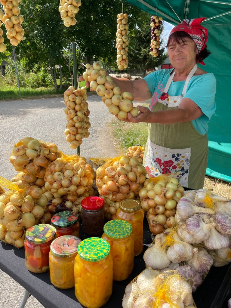 Ja sitten ne sipulit! Peipsin rannoilla kullankeltaisia sipuleita viljelevät vanhauskoiset ortodoksimummot, ja sadonkorjuuaikaan elo-syyskuussa muhkeita sipulilettejä roikkuu kuivumassa joka talon seinustalla kylätien varrella. Pysähdyimme Kolkjan kylässä tienvarteen, ja ostimme sympaattiselta rouvalta kotiinviemisiksi ison sipuliletin, hunajaa ja suolakurkkuja, kaikki omaa tuotantoa.