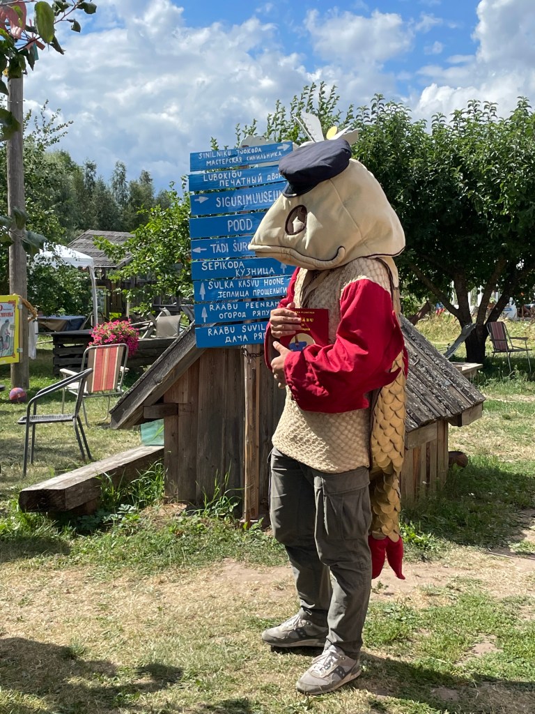 Kolkjan kylässä Peipsimaan vierailukeskuksessa pääsee tutustumaan lähemmin Peipsin alueen mielenkiintoiseen kulttuuriin. Alueella on asunut jo satoja vuosia vanhauskoisten yhteisö, joilla on omaperäisiä perinteitä ja kansantaidetta. Vierailukeskuksessa voi osallistua esimerkiksi kankaanpainantakurssille, tai ostaa tuliaiksiksi perinteisiä käsitöitä. Pihamaalla lapsia nauratti ja leikitti herra Kuha, ja ihmiset nautiskelivat kahvilan herkkuja omenapuiden katveessa. Meillä oli kuitenkin jo kiljuva nälkä, ja koska Kolkjan kala- ja sipuliravintola oli täynnä, palasimme Alatskiven kylälle lounaalle. Onneksi kuhaa oli tarjolla sielläkin pienessä ja edullisessa Kivikõrts-tavernassa.