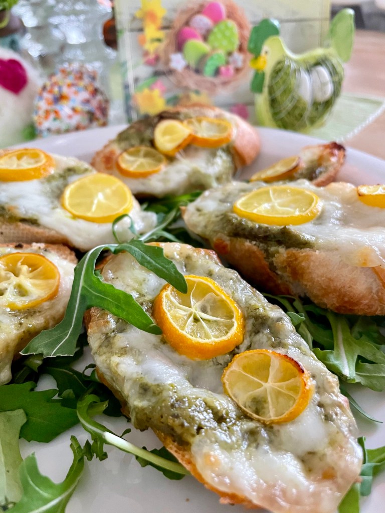 1. Viipaloi patonki viistoon ja levitä viipaleille nokare pestoa.