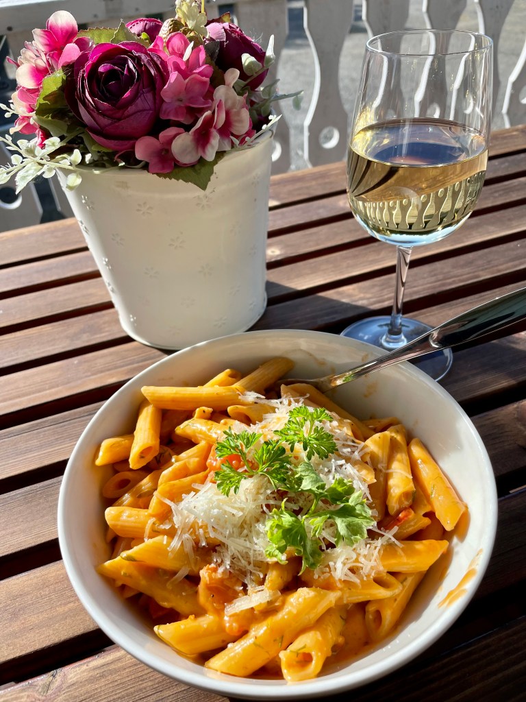 Vietimme eilen perinteiset rapujuhlat kymmenen hengen voimin. Rapusaalis oli tänä vuonna suorastaan valtava, ja saimme oikein urakoida, että vadit tyhjenivät. Lisänä meillä oli pöydässä katkarapuja, joita jäi vielä tälle päivälle reilu kulhollinen. Pyöräytin niistä nopean ja helpon katkarapupastan sunnuntailounaaksi. Hyödynsin kastikkeessa myös kasvihuoneemme tomaattisatoa sekä juhlista jääneen viinipullon pohjan. Sunnuntai-iltapäivän keli oli vielä yllättävän lämmin ja kesäinen, joten nautin lounaani aurinkoisella terassilla.