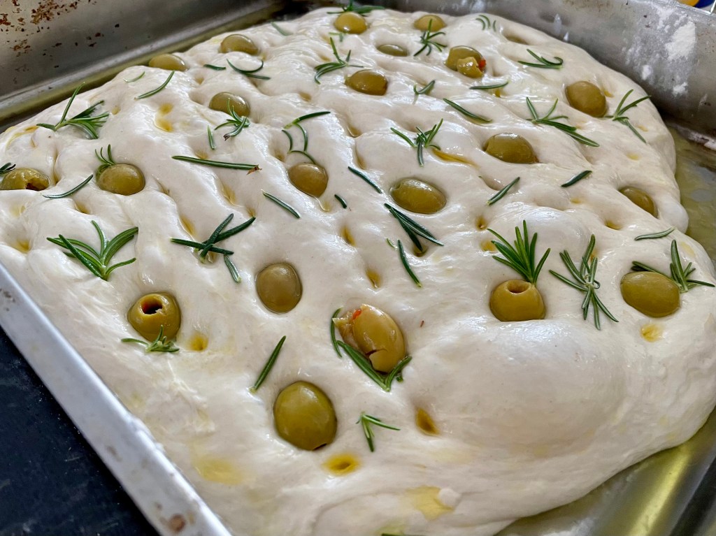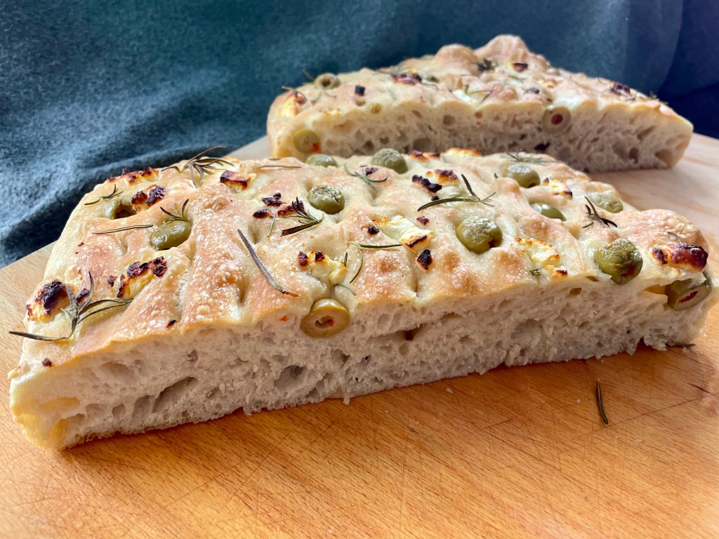 Kuten edellisessäkin focacciassa, tähänkin voi käyttää monenlaisia täytteitä, kuten kirsikkatomaatteja, oliiveja, yrttejä, juustoa – mitä nyt milloinkin tekee mieli. Itse laitoin tällä kertaa tuoretta rosmariinia, kokonaisia oliiveja sekä murusteltua fetaa. Koska leivästä tulee melko paksu, sen voi leikata halki ja täyttää esimerkiksi mozzarellalla, salamilla ja rucolalla – mutta ilman täytteitäkin leipä maistuu taivaallisen hyvältä esimerkiksi oliiviöljyllä sipaistuna.