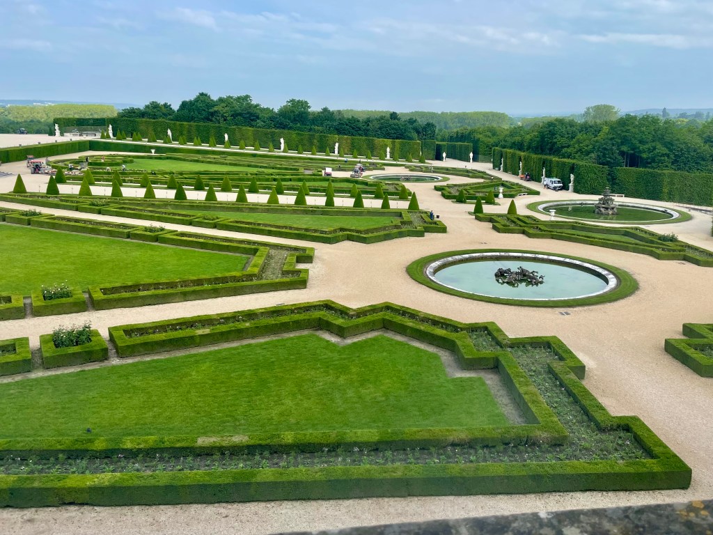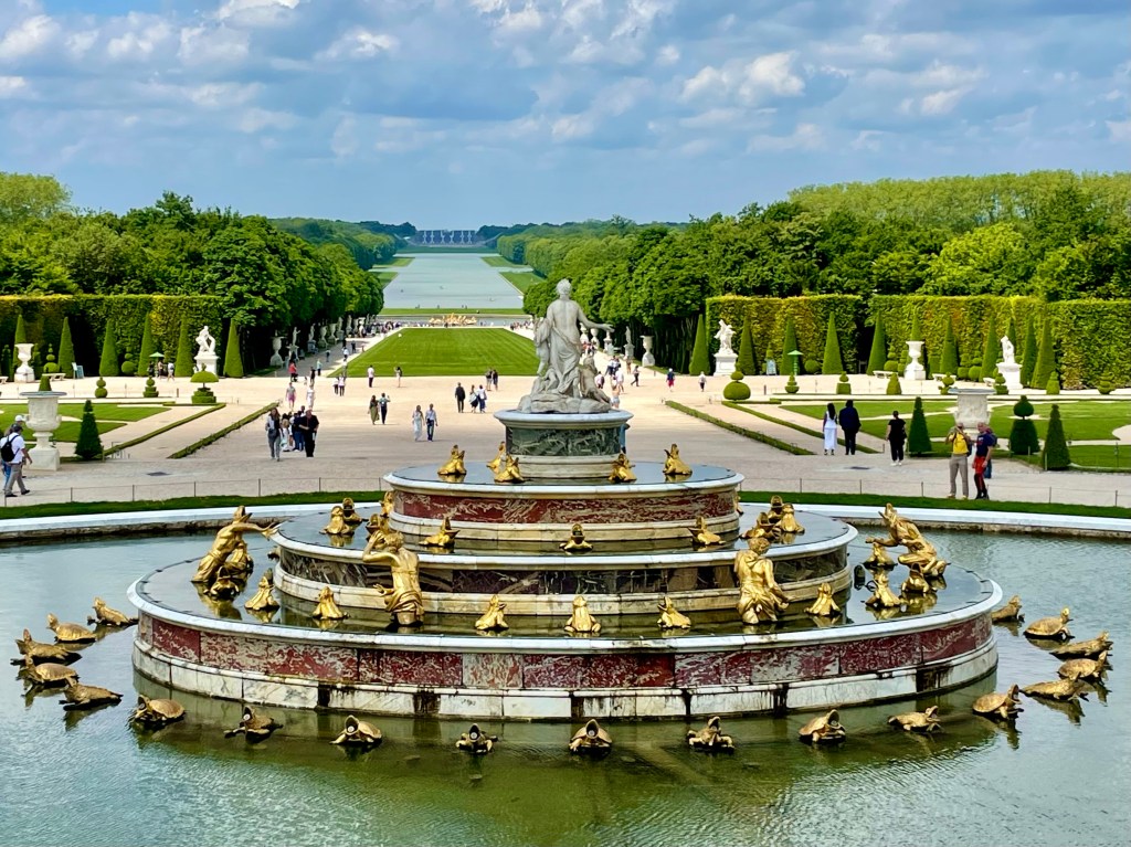 Versailles’n alue on käsittämättömän laaja, 1 070 hehtaaria. Palatsin ja valtavan puutarhan lisäksi alueella on Grand Trianonin ja Petit Trianonin palatsit sekä lukuisia muita rakennuksia. Jos aikaa on koko päivä ja kunto kohdallaan, aluetta voi tutkia kävellen. Me sen sijaan päätimme vuokrata golkärryn, jolla huristelimme puutarhassa kahden tunnin ajan. Siinä ajassa ehdimme juuri ja juuri kiertää puutarhan ympäri ja pysähtyä ihailemaan kesäisin puutarhassa järjestettäviä vesinäytöksiä, joissa suihkulähteet tanssivat musiikin pyörteissä.